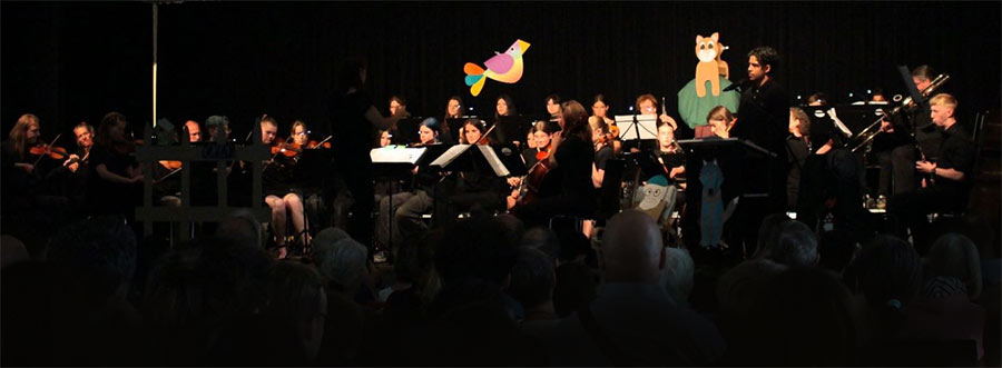 vor der Pause. Yahia Ghadhab aus dem 10. Jahrgang nahm das Publikum unterhaltsam auf das Abenteuer Prokoffjews